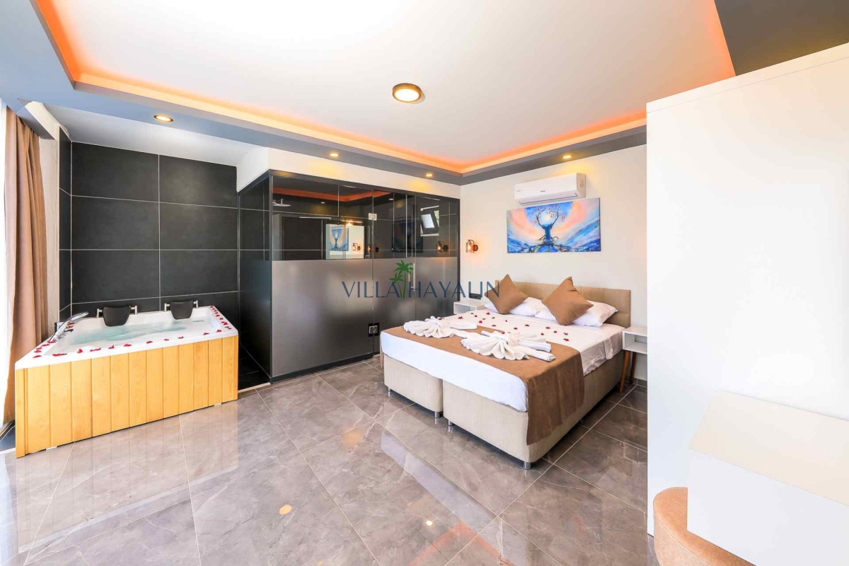 1.Yatak odası: Çift kişilik bir adet yatak, elbise dolabı, komodin, klima, jakuzi, banyo ve tuvalet bulunmaktadır.