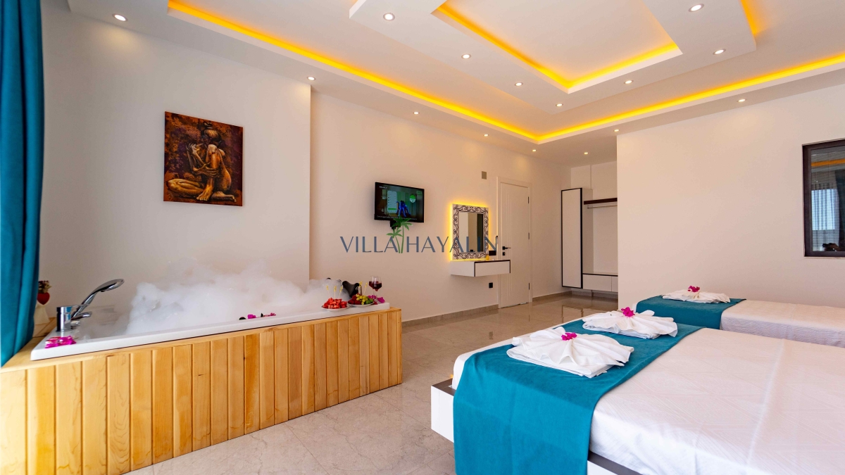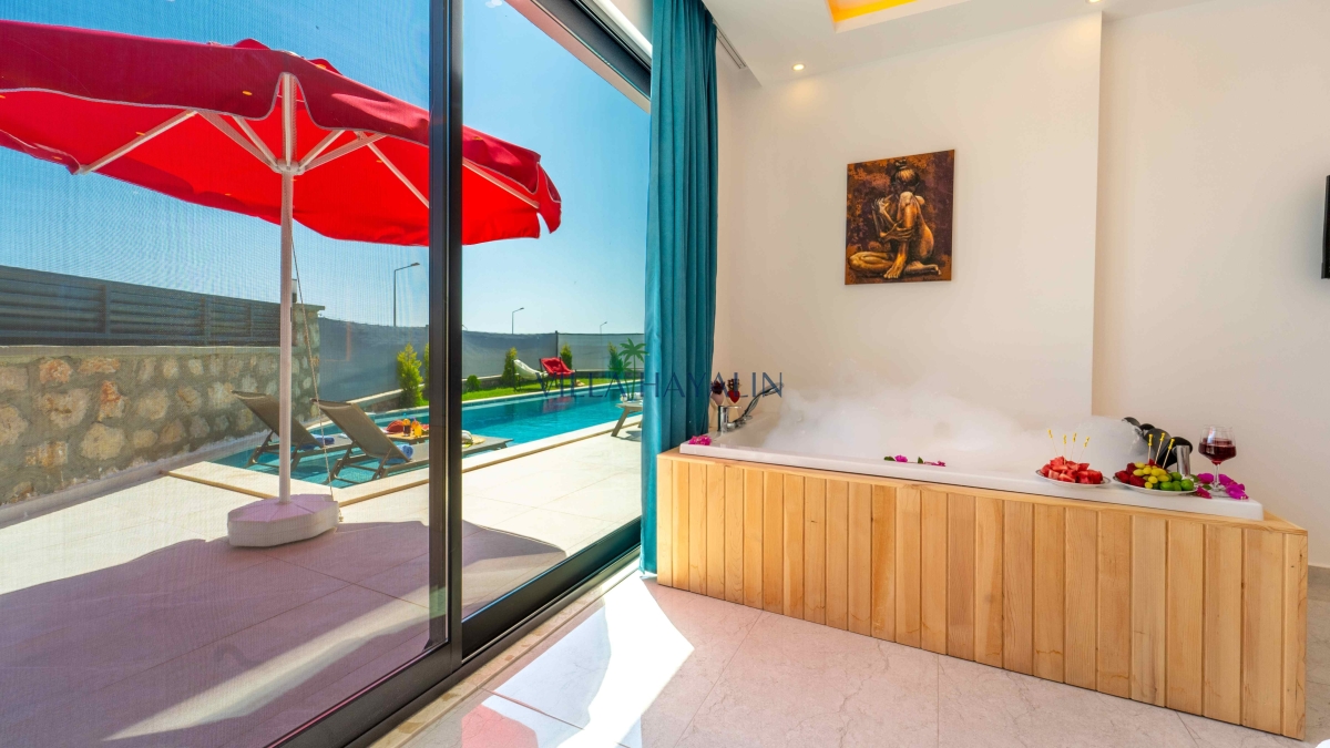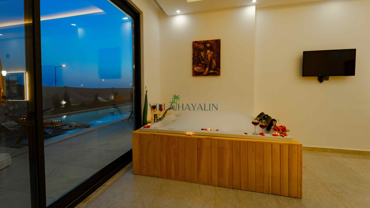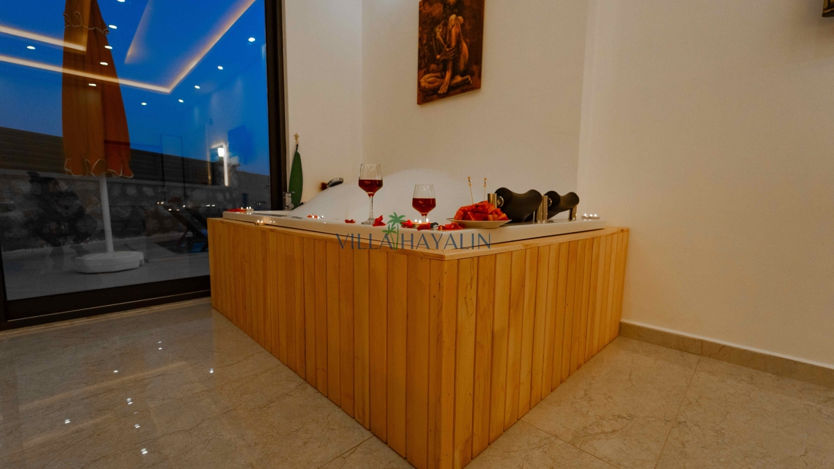 Her iki yatak odasında bulunan jakuzi ile rahatlamak, villanın sunduğu ayrıcalıklardan sadece biridir. Ayrıca, villada yer alan jakuzi ve sauna ile tüm yılın stresini ve yorgunluğunu atabilirsiniz. Özenle seçilmiş lüks dekor ve modern tasarım, konaklamanızı unutulmaz kılacak; tatiliniz boyunca kendinizi ayrıcalıklı hissedeceksiniz.